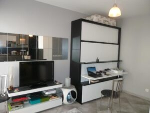 L'appartement se distingue par son ingénieux lit escamotable, qui se transforme en bureau en quelques secondes, permettant de moduler l'espace selon vos besoins et de profiter pleinement de la surface disponible.